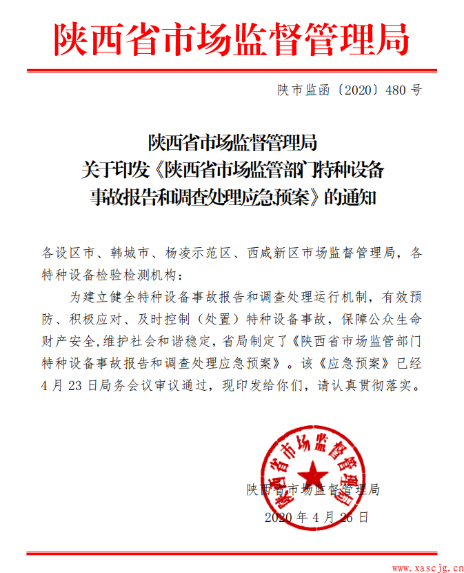 关于印发《陕西省市场监管部门特种设备事故报告和调查处理应急预案》的通知