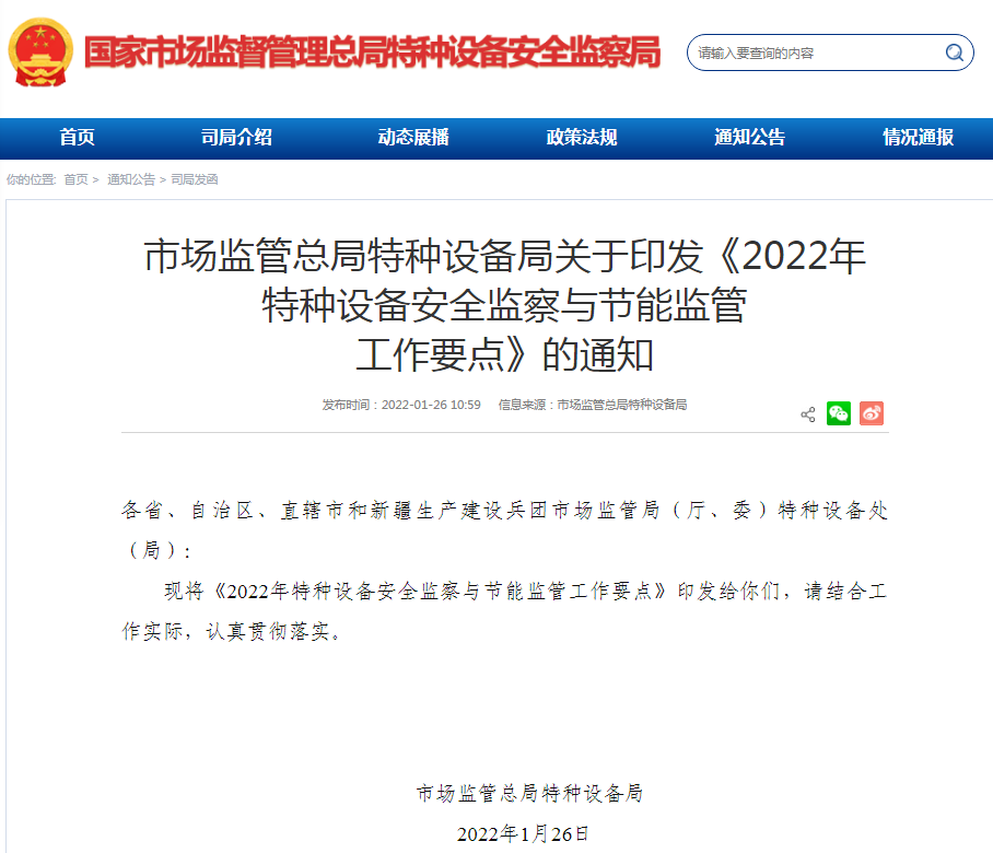 市场监管总局特种设备局关于印发《2022年特种设备安全监察与节能监管工作要点》的通知